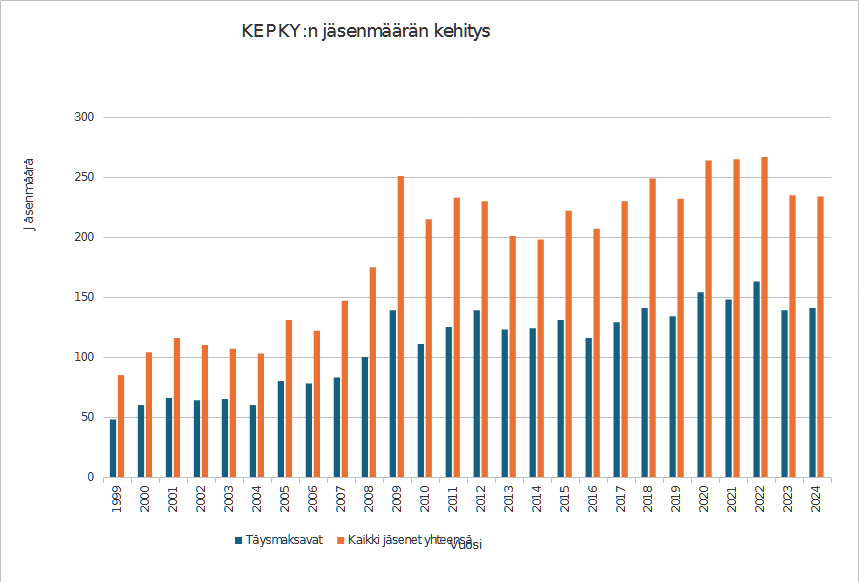 Yhdistyksemme jäsenmäärä on pysynyt pitkään melko vakiona. Viime vuosina on tullut ilahduttavan monta uutta jäsentä mutta nyt oli havaittavissa pientä notkahdusta. Vuosikokouksen päätöksen mukaisesti jäsenmaksu on 16 euroa perheen 1. jäseneltä ja samaan perheeseen/ruokakuntaan kuuluvalta lisäjäseneltä 4 euroa jäseneltä. Jäsenmaksuja kertyi vuoden aikana yhteensä 2 715 e, ja jäsenten lukumäärä oli 234. (vrt. v. 2023: 2 670 e, ja jäseniä 235, v. 2022: 3 096 e ja jäseniä 267, v. 2021: 2 452 e ja jäseniä 265).